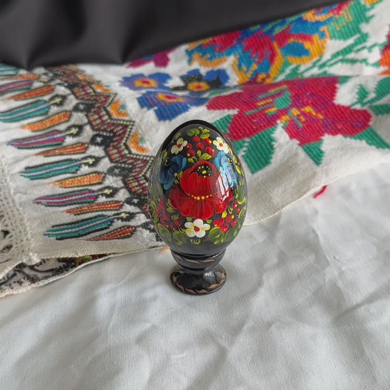 A wooden Easter egg, painted by hand in the "Petrykivskii painting" technique. The pysanka and the stand are carved separately. Pysanka has a very high-quality glossy coating. Hand painted, author's work